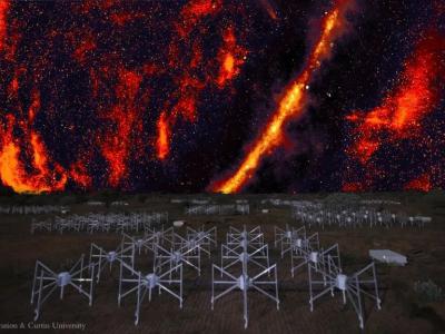 这张合成图像显示了在澳大利亚内陆的Murchison Widefield Array射电望远镜上翱翔的...