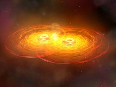 两个合并的星系在时空中产生引力波的示意图。(图片来源:NASA/CXC/A.Hobart)(蜘...
