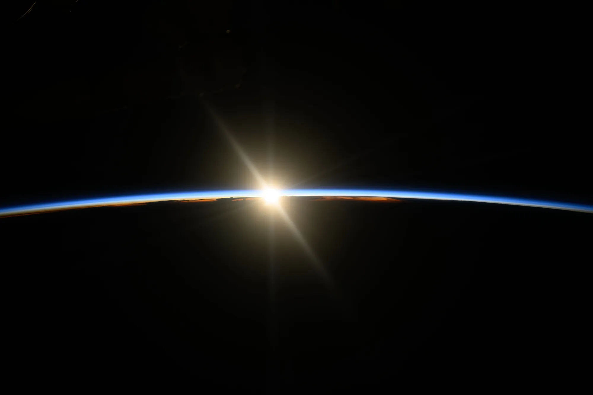 国际空间站在太平洋上空261英里的东北轨道上运行时,这张照片捕捉到了轨道日出照亮...
