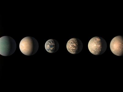 TRAPPIST-1的世界排列在这位艺术家的印象中。(图片来源:美国国家航空航天局/喷气...