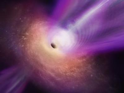 一位艺术家对超大质量黑洞爆发出强大喷流的印象。(图片来源:S.Dagnello(NRAO/AU...
