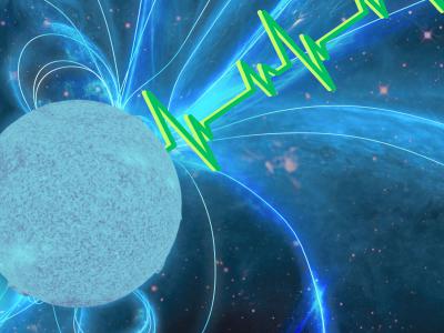 一幅插图显示了一颗中子星脉冲星爆发出快速的射电暴。(图片来源:Robert Lea(与C...