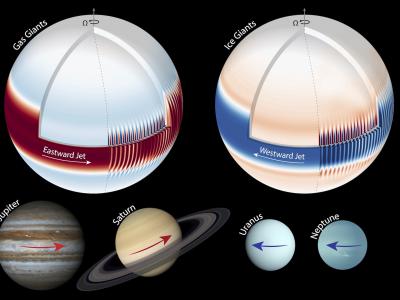 气态巨行星木星和土星表现出向东流动的赤道急流,而冰巨行星天王星和海王星则表现出...