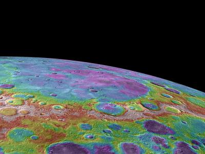 新的研究发现,在这张假彩色图像中看到的水星可能有一层深层的钻石。(图片来源:美...