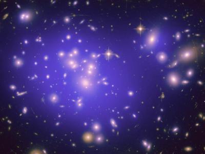 星系团abell 1689的视图,其中有紫色星系和明亮的恒星,没有显示其巨大的暗物质含量...