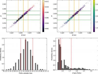 (q,e)网格中所有轨道(1000)在与土星相遇期间的最小接近距离(颜色编码)值(左...