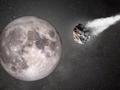 一幅插图显示,一颗小行星在月球附近碎裂成陨石碎片(图片来源:Robert Lea(与Can...