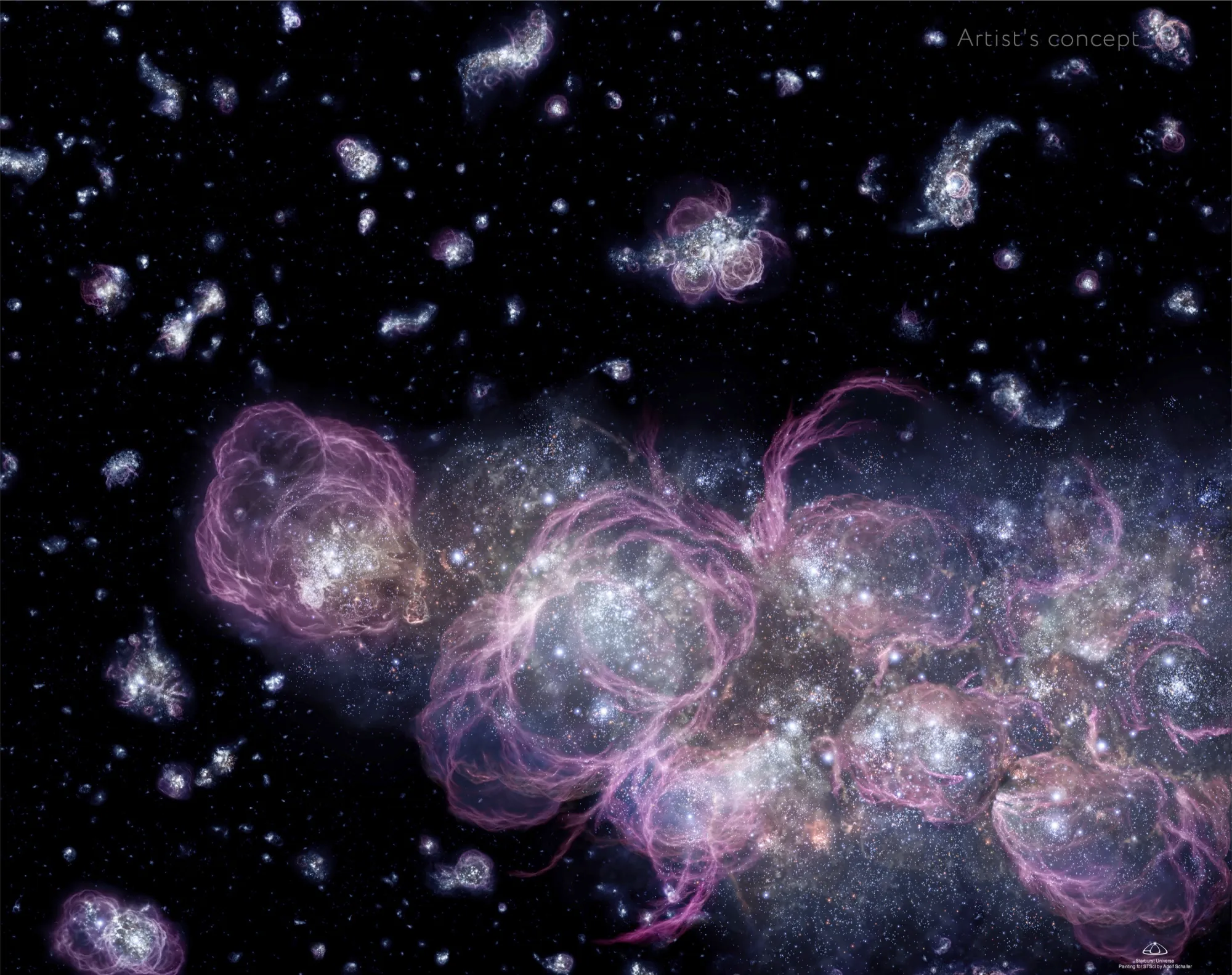 这位艺术家的概念展示了宇宙在不到十亿年时的样子,大约是现在年龄的7%。恒星形成贪...