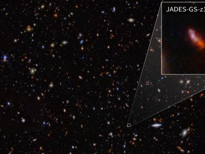 星系JADES-GS-z14-0,距离地球338亿光年。(图片来源:美国国家航空航天局、欧洲航...