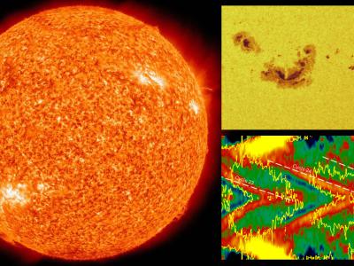 (主)具有11年太阳周期的太阳(右上)2024年5月5日发生的大太阳黑子的日震和磁成像...