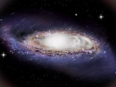 一位艺术家对银河系扭曲圆盘的印象,它被一个稍微扁平的暗物质光环包围。(图片来源...