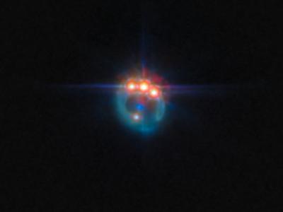 椭圆星系的引力透镜形成了一个弧,顶部有三个亮点,代表了一个名为RX J1131-1231的...