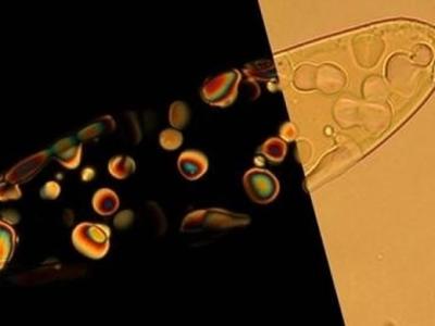图片显示的一滴浓缩的纳米-DNA,其中含有偏振光下才能看到的液晶滴(左侧)。这些液...