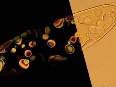这张图片显示的是一滴凝聚的纳米DNA(nano-DNA),其中的小颗粒是处于液晶相的纳...