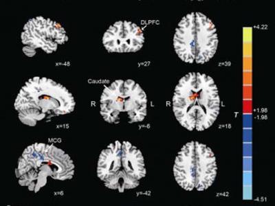 这是多重回归的结果(P< 0.05, AlphaSim corrected). 暖色调表示显著正相关, 冷...
