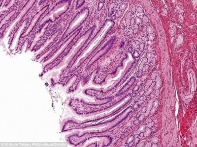 小肠的十二指肠。美国科学家成功在老鼠体内培育出功能完善的人类肠道组织,这一研...
