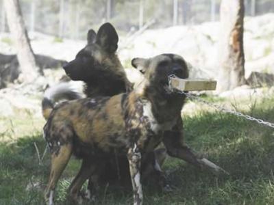 非洲野狗争夺一根浸渍有血液或单个化学成分的木头。两者具有同样的吸引力。 (蜘...