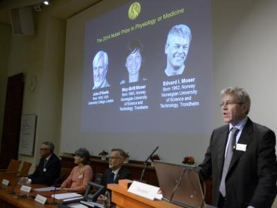 今届医学奖由奥基夫(左)、挪威神经科学家莫泽(中)及其妻迈-布赖特(右)夺得。 ...