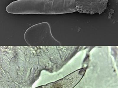 研究指人脸存在毛囊蠕形螨(上)和皮脂蠕形螨(下)两种毛囊虫 (蜘蛛网报道)美国北...