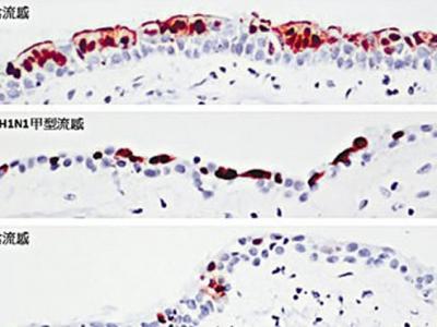 图片显示人类支气管上皮组织,棕色部分显示被病毒感染的细胞,蓝色部分显示非感染...