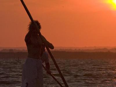 一渔民在传统的芦苇制的撒丁岛船上 据EurekAlert!:哪个先出现:男人还是女人?...