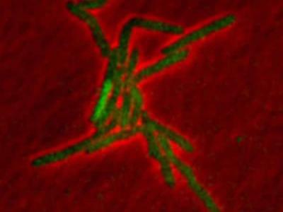 这是耻垢分枝杆菌中KatG-DsRed2融合蛋白(伪绿色)的表达 研究人员发现了当受到...