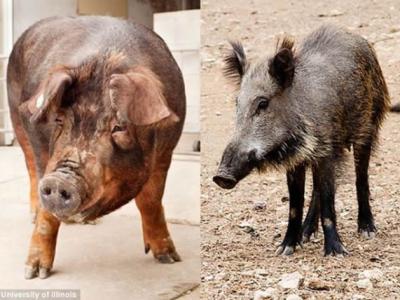 左为一头杜洛克猪,右为它的近亲野猪,与它的祖先类似。根据一项新的基因研究发现...