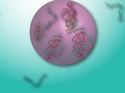 RNA链(蓝色物质)和RNA酶(红色物质)在含有葡萄聚糖的溶液中相互结合,科学家表...