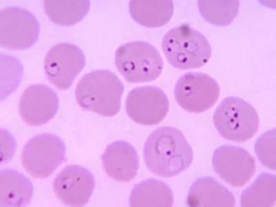 这幅图片展示了红细胞,其中一些被环状体阶段的疟原虫感染。在一次感染中,寄生虫...
