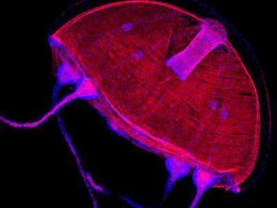 水母的肌肉(红)与核质(蓝) 许多动物的一个显著特征就是能够利用肌肉组织进行...
