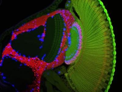 苍蝇复眼的感光神经细胞(绿色)延伸它们的轴突到大脑视觉神经中枢。科学家已经发...