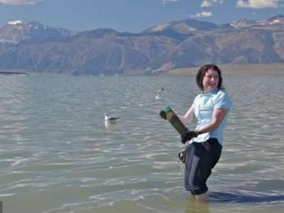 手拿沉积物柱芯采样器的菲丽萨·沃尔菲-西蒙博士,她是研究论文执笔人之一。样本...