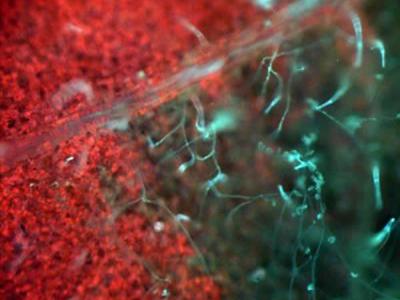 Phytophthora infestans 病菌(青色)的从损伤死组织裡长出并入侵马铃薯叶的活组...