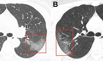 中国卫生部门公开一名感染2019-NSV冠状病毒的女性患者的肺部图片( © 照片 : ...