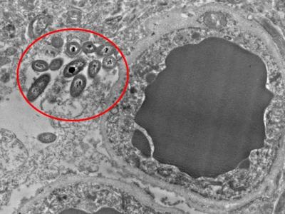 研究人员在大脑组织切片的血管旁,发现肠道细菌(红圈)。(蜘...