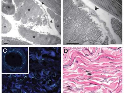 间质的胶原蛋白束以星号标记(上图左);箭头指向其中一个细胞...