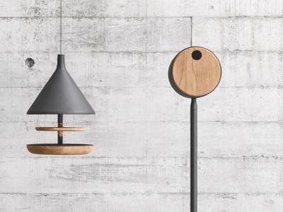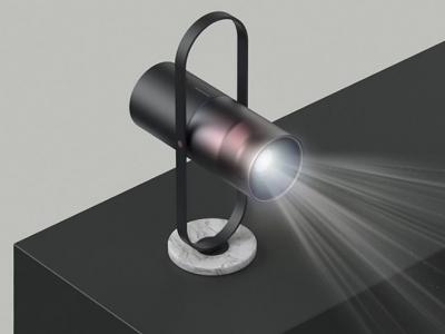 PHOS置于智能云石基座上的胶囊状框架内。圆柱形投影仪PHOS以抛光金属和磨砂玻璃制成...