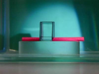 粉红色物体似乎消失在被置于水下并受到绿光照射的大块方解石后面 (蜘蛛网www.e...