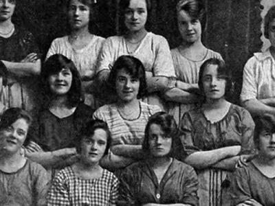 灵异:1900年贝尔法斯特市亚麻厂黑白老照片上一名女工的肩膀上有只突兀的手(右下角...