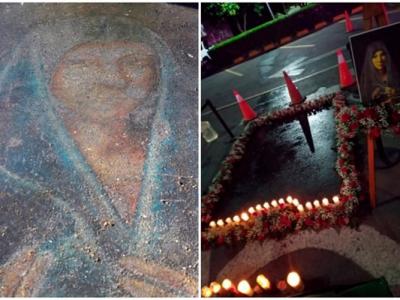 民众以鲜花和蜡烛(右)围绕以粉笔绘画的圣母玛利亚像(左)。有民众特意到场膜拜画...