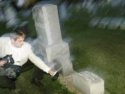 超自然研究者诺亚-沃斯在森普雷里公墓将一台摄像机对准一台电磁频率装置来记录任...