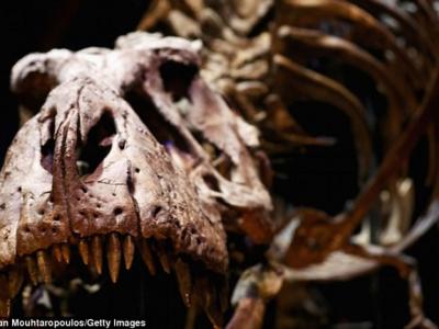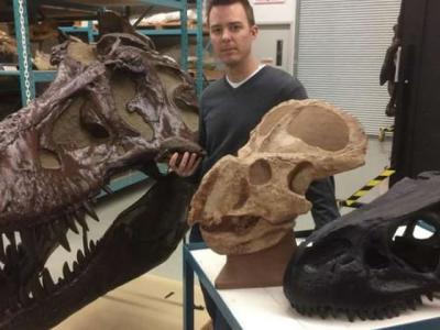 乔丹?马伦博士站在加拿大自然博物馆的复制恐龙化石...