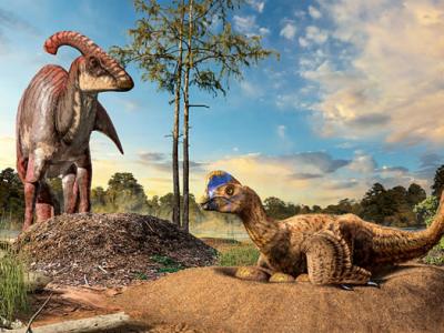 研究表明,鸭嘴龙(左)会将蛋埋在土堆中,而窃蛋龙却会将蛋下在开放巢穴中。(J...