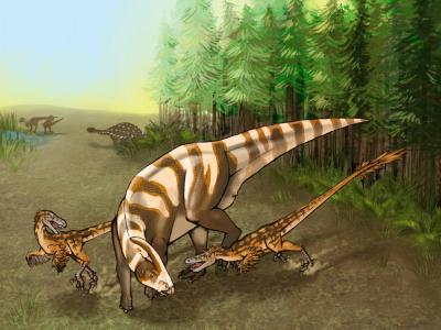 复原图:两只Saurornitholestes sullivani攻击鸭嘴龙(Mary P. Wiliams)(蜘蛛网...