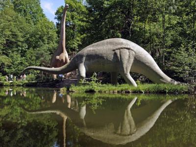 2013年,德国包森附近的恐龙公园里,游客们经过腕龙(Brachiosaurus,左)以及梁...