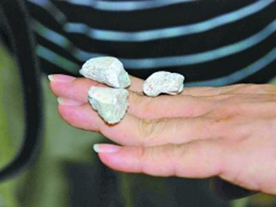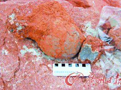 当地考古人员在河源恐龙骨骼化石发掘地现场捡拾到的一枚恐龙蛋化石 河源恐龙骨...
