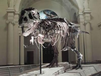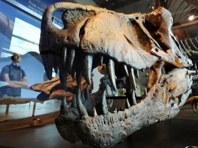 这就是名为“苏”的大型暴龙化石骨架前视图,可以看到它那巨大的脑袋。不过科学家...