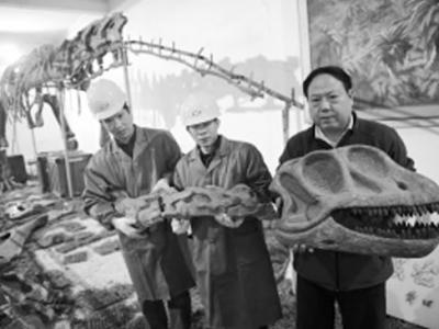 成都理工大学博物馆,工作人员展示拆解的合川马门溪龙标本 恐龙也有高血压?...