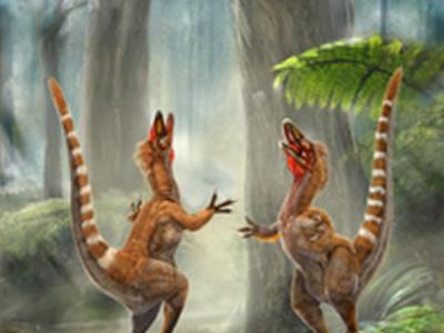 两个中华龙鸟正在炫耀它们橘黄和白色条相间的尾巴。 北京——在发现了1.2亿多年...