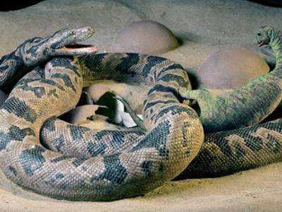 重现远古巨蛇吃恐龙幼仔的场景 “蛇和恐龙蛋”化石 远古巨蛇吃恐龙幼仔图解...